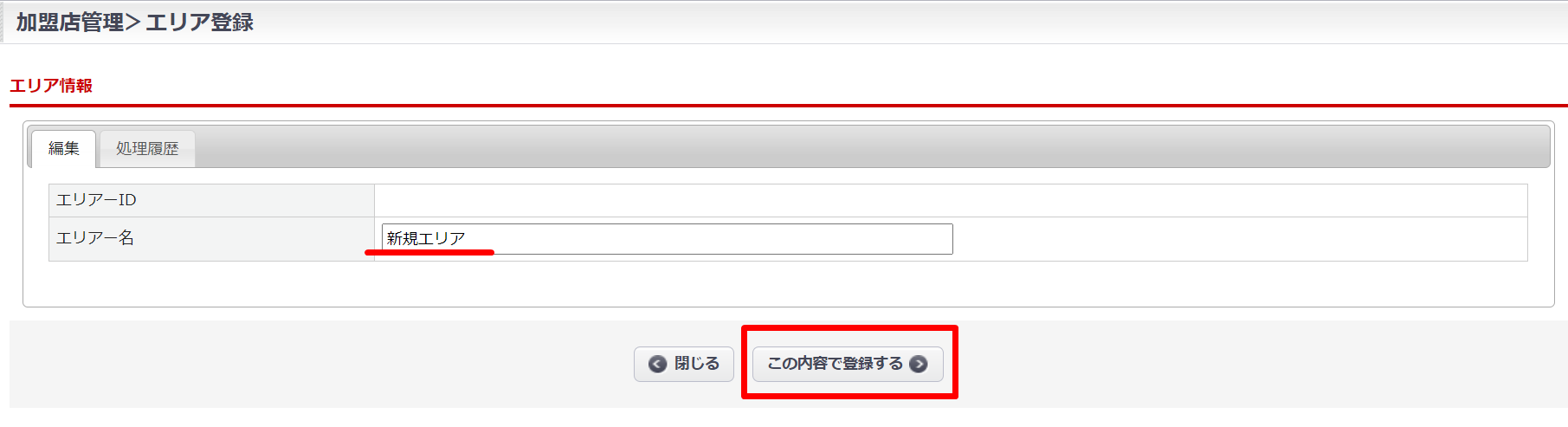 エリア名を入力後、【この内容で登録する】ボタンをクリック