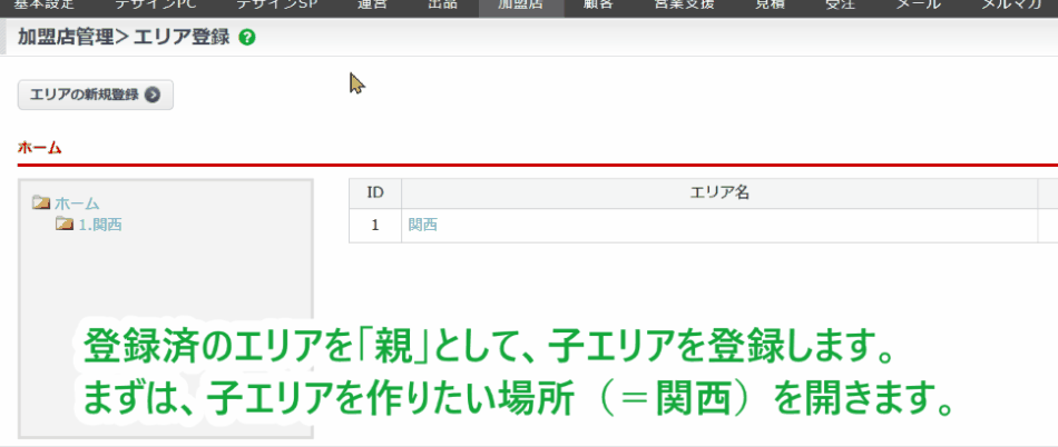 親としたいエリアを開いた状態で【エリアの新規登録】をクリックすると、当該エリア内に子エリアを登録できます。