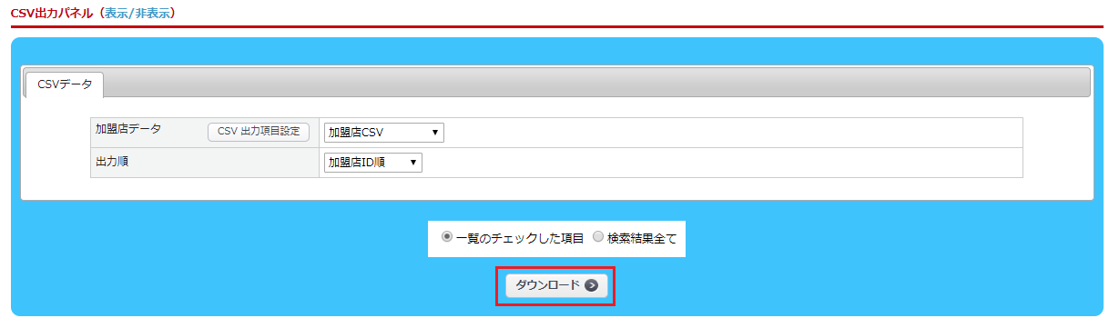 CSVファイルは加盟店 > 加盟店管理 の「CSV出力パネル」からダウンロード可能です。
