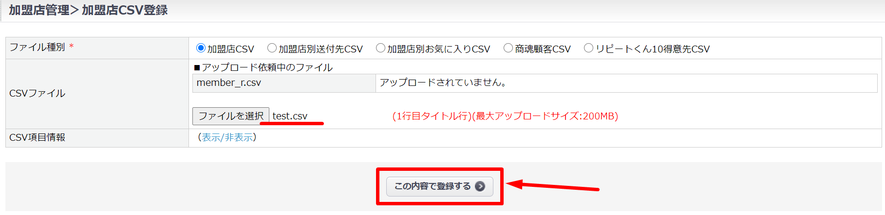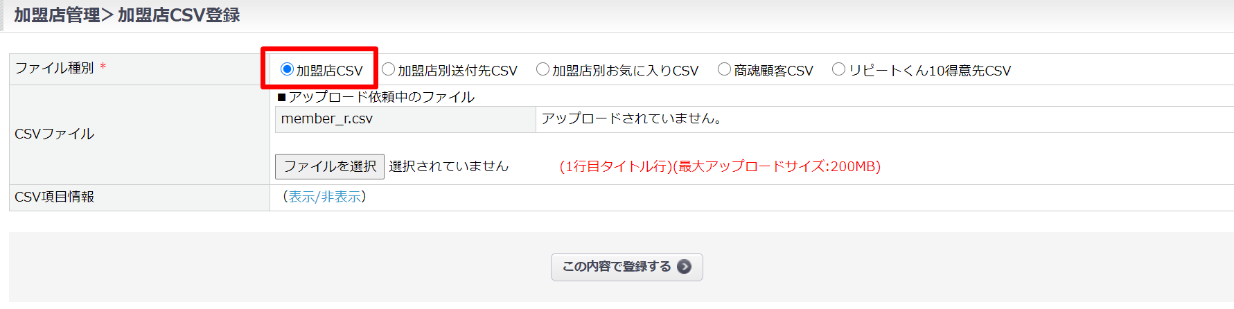 加盟店登録の際は、ファイル種別は「加盟店CSV」となります。