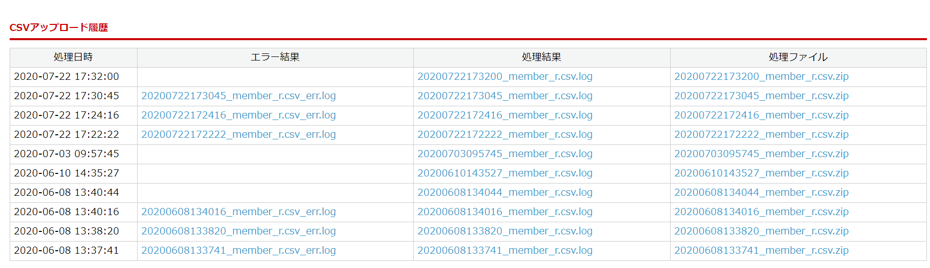 アップロードが完了すると下部の「CSVアップロード履歴」に結果が表示されます