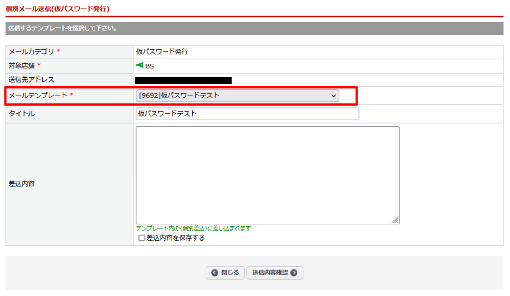 本文内に {仮パスワード} の差込タグを利用することで、メール送信時に仮パスワードが送信されます。