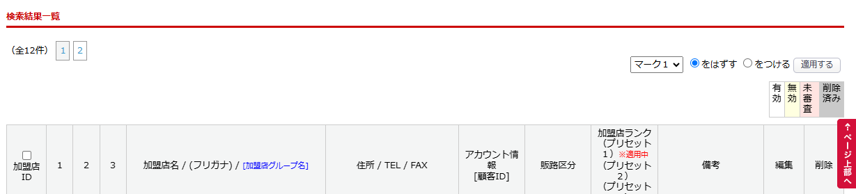 マークを付けると、加盟店 > 加盟店管理 の検索条件設定から【マークによる絞り込み】が可能となります。