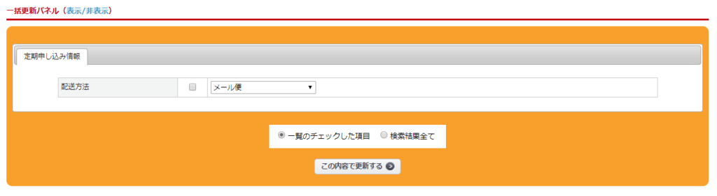 継続中の定期に絞り込み、一括更新パネルにて配送方法を変更してください。