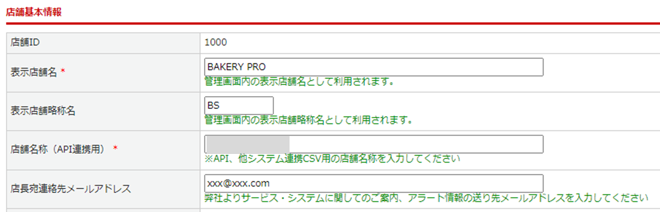 | 店舗名称(API連携用)* | 連携に使用する店舗名称を入力します。 入力必須のため、連携を使用しない場合は「表示店舗名」等を入力ください。 |