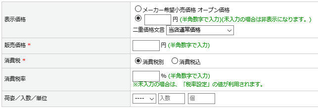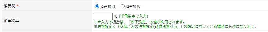 | 消費税率表記 | 商品詳細ページにて、消費税率を表示するかしないか設定します。 |
