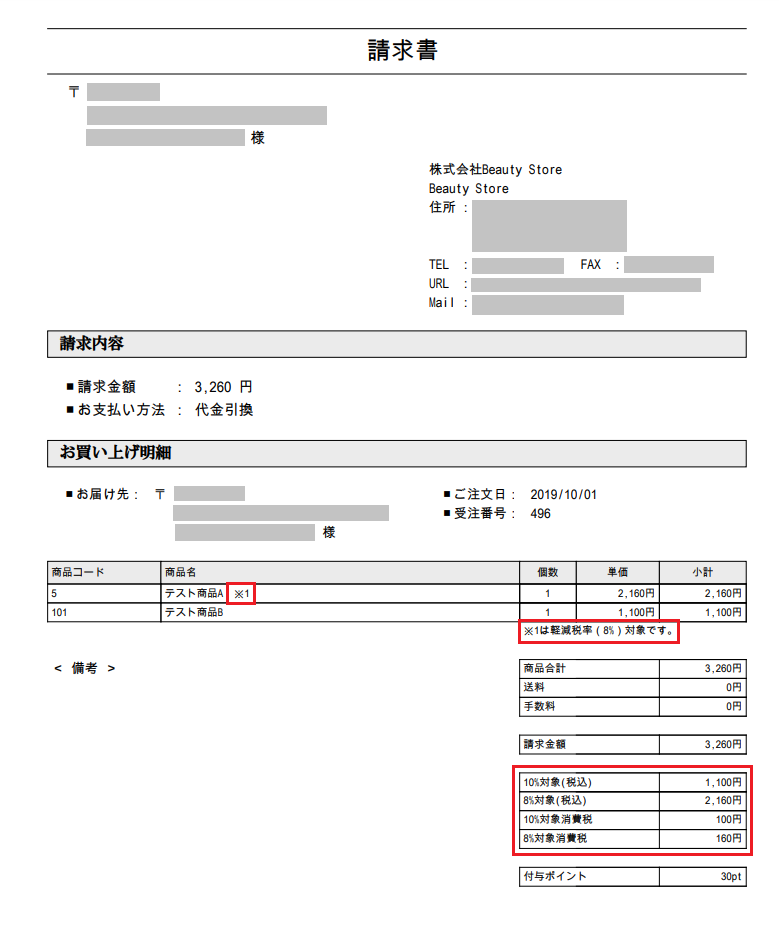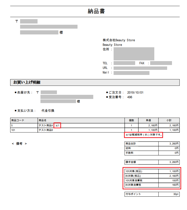 | 8%(軽減税率の対象商品)のみ | ・軽減税率設定:全商品一律 ・消費税率:8 ・送料消費税率:10 ・手数料料消費税率:10 |