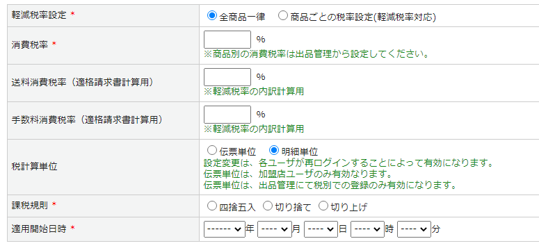 | 軽減税率設定 | 税率設定の適用範囲を指定します。 ・全商品一律:税率設定で設定された消費税率を全商品に適用 ・商品ごとの税率設定:出品管理にて設定された消費税率を適用 ※出品商品にて未設定の場合は税率設定の内容が適用 |