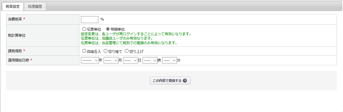 「税率設定」にて情報を入力後、【この内容で登録する】ボタンをクリックして登録してください。