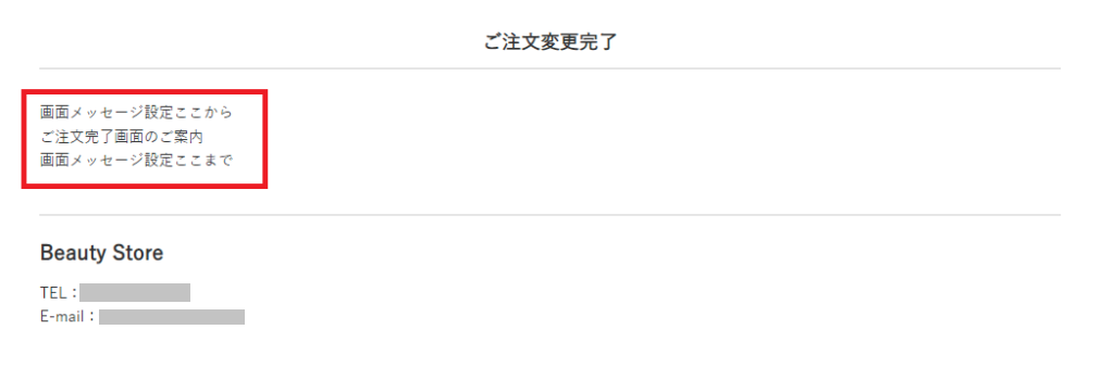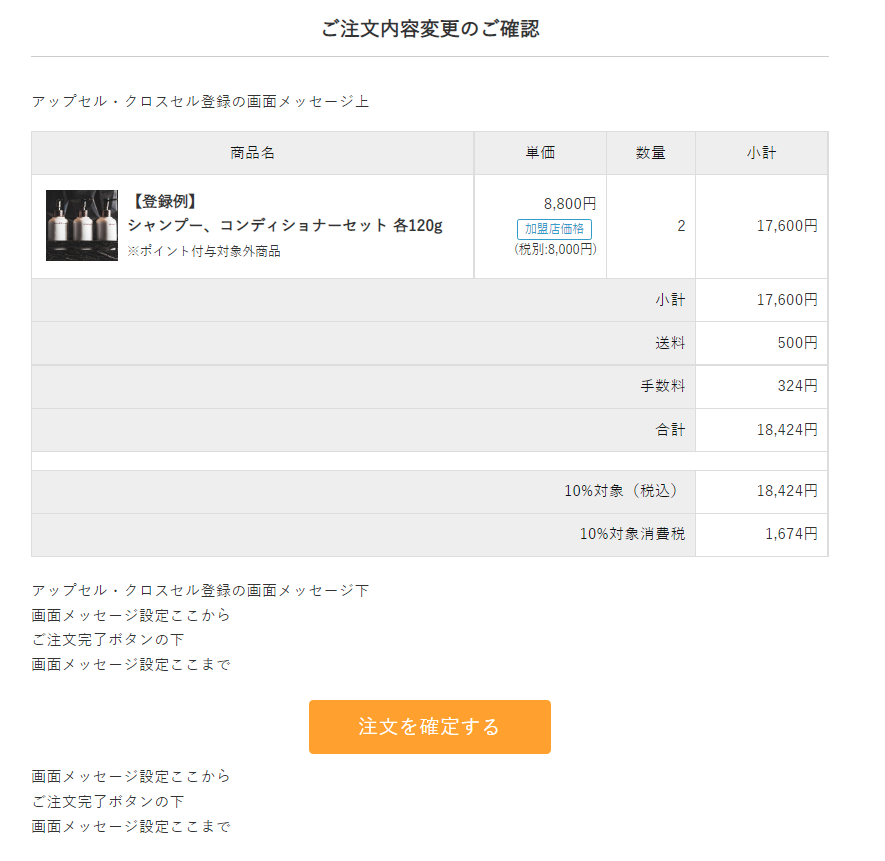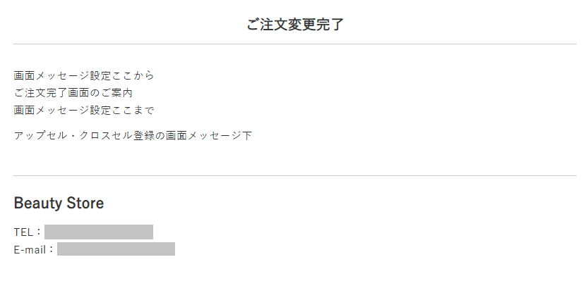 | 注文完了後のアップセル・クロスセル (確認画面) | 注文変更画面に表示する画面メッセージを設定します。 それぞれパソコン用とスマートフォン用で設定できます。 <注文変更確認画面> |