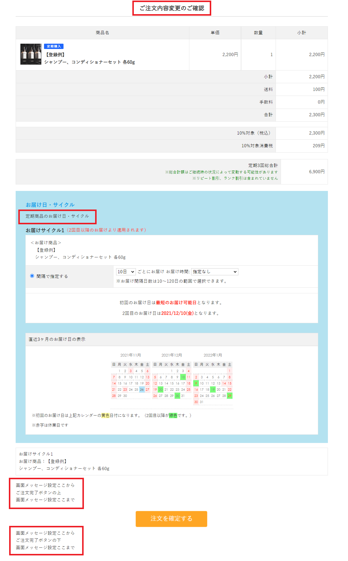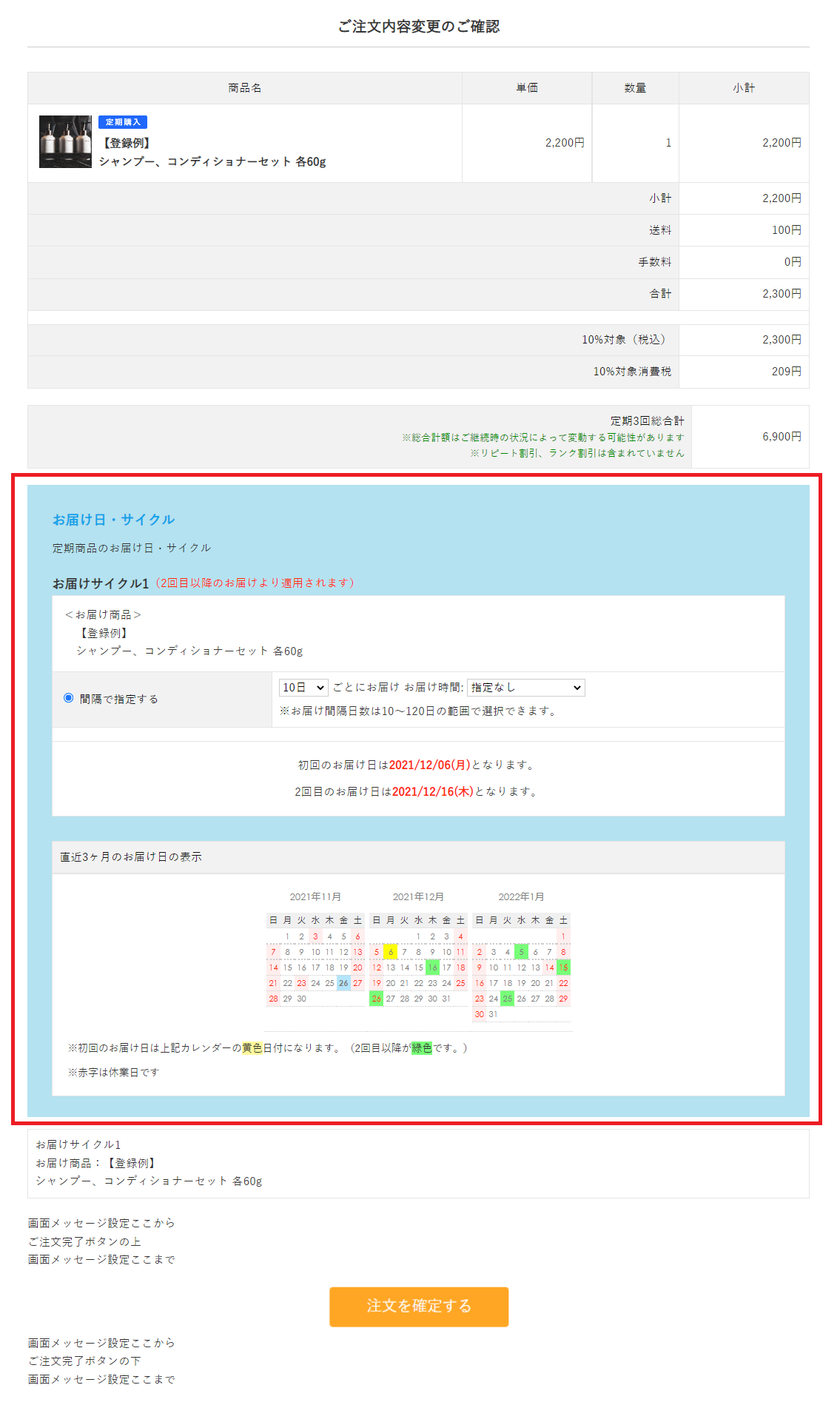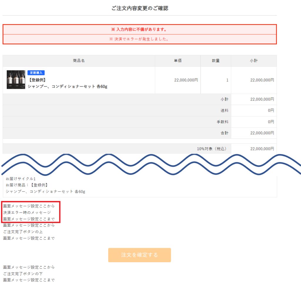 表示例:お届けサイクルの異なる定期商品にアップセル後の注文内容変更ご確認画面