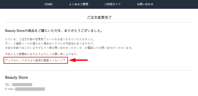 その後、【注文を確定する】ボタンをクリックすると、注文完了後アップセル・クロスセルが実行されて、ご注文内容変更完了画面に遷移します。