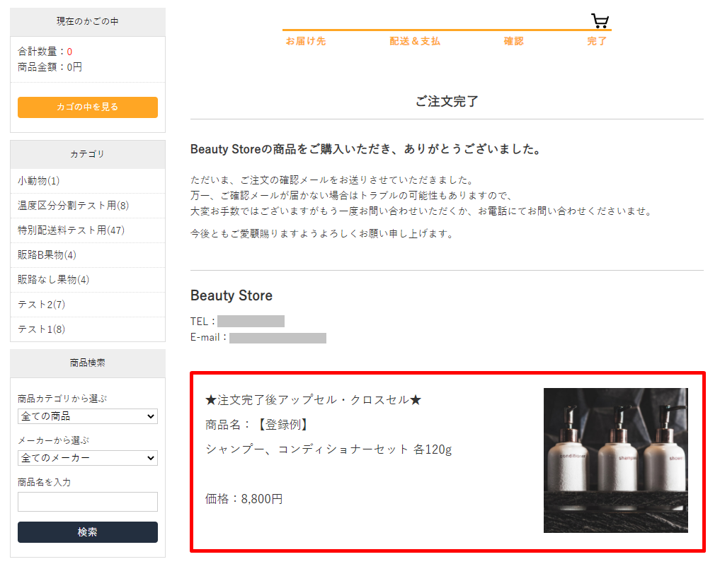 注文変更前の請求金額が0円(支払方法:無料です)の場合、注文完了後アップセル・クロスセルは表示されません。