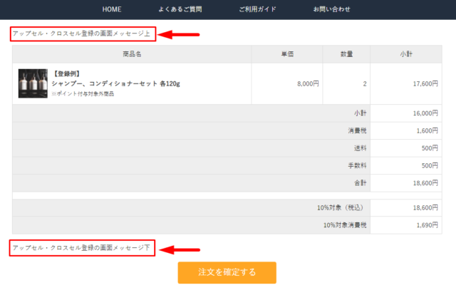 ※通常のアップセル・クロスセル機能でも「ご注文完了」を選択できますが、注文完了後アップセル・クロスセルの動きとは異なります。