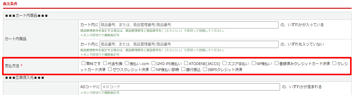 「ご注文完了」を選択した場合、アップセル・クロスセルの表示条件設定に「支払方法」が追加されます。