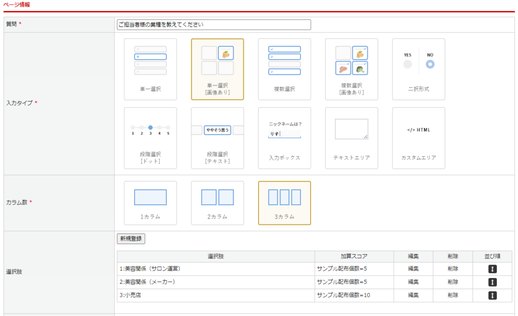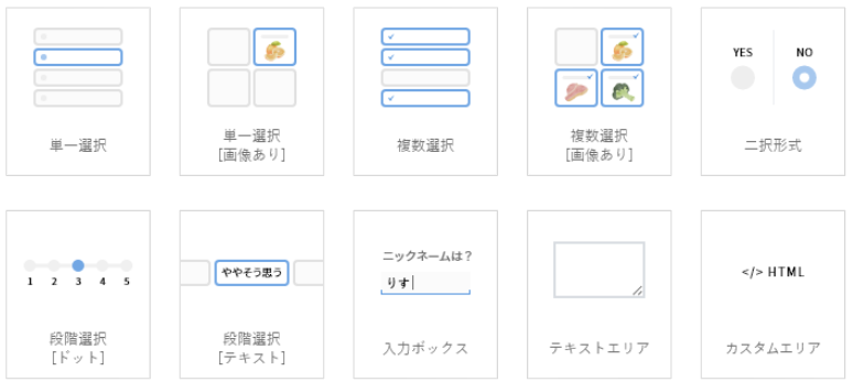 質問形式が10パターンから選択でき、質問形式によって回答のカラム数も設定することができます。