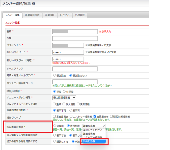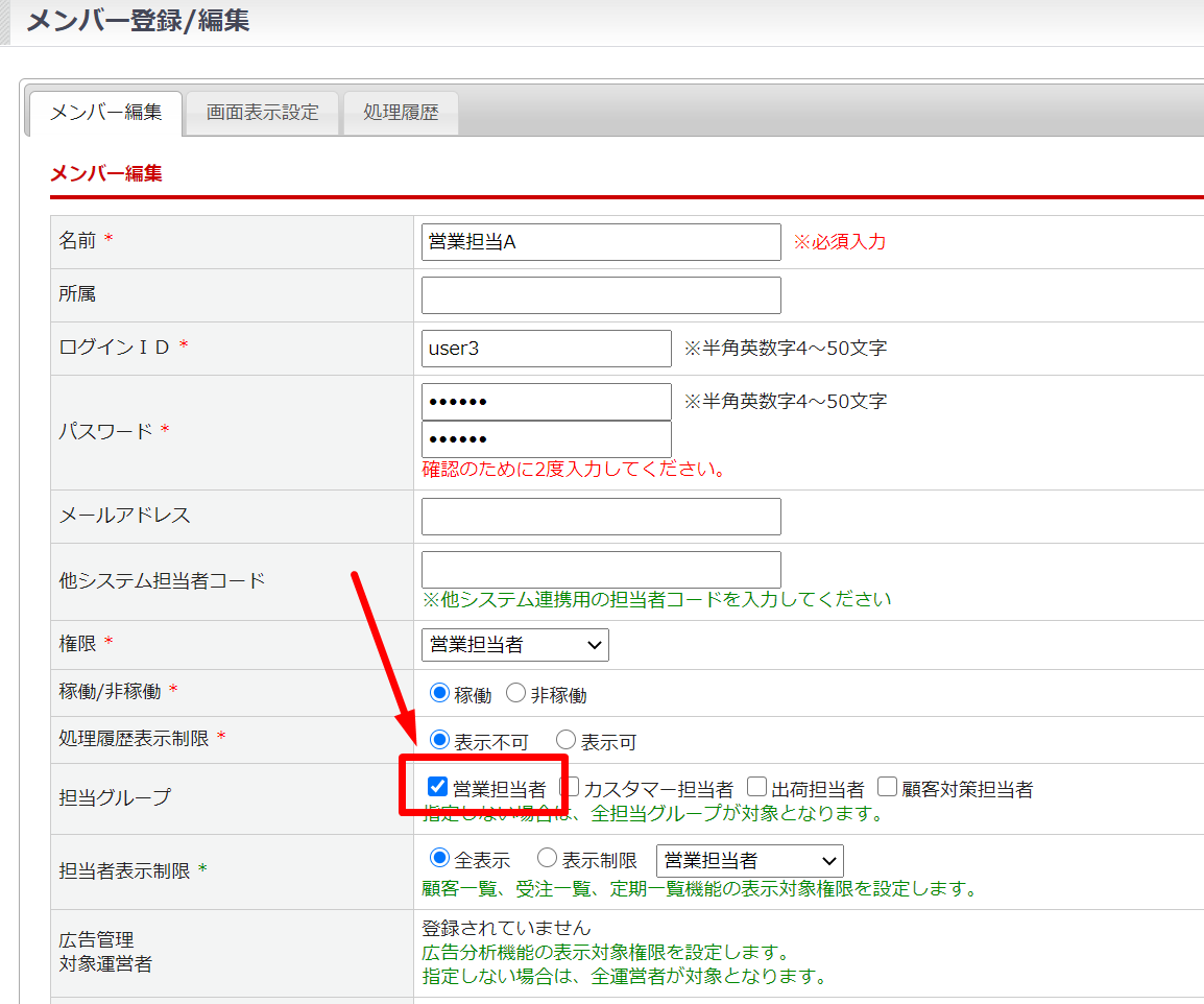 システム設定>メンバー管理>より登録・編集画面を開き、[営業担当者]にチェックを入れます。