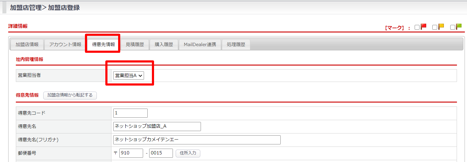 設定する加盟店の加盟店登録画面「得意先情報」タブを開き、「社内管理情報>営業担当者」欄のプルダウンより担当者を選択後、 この内容で登録するをクリックしてください。