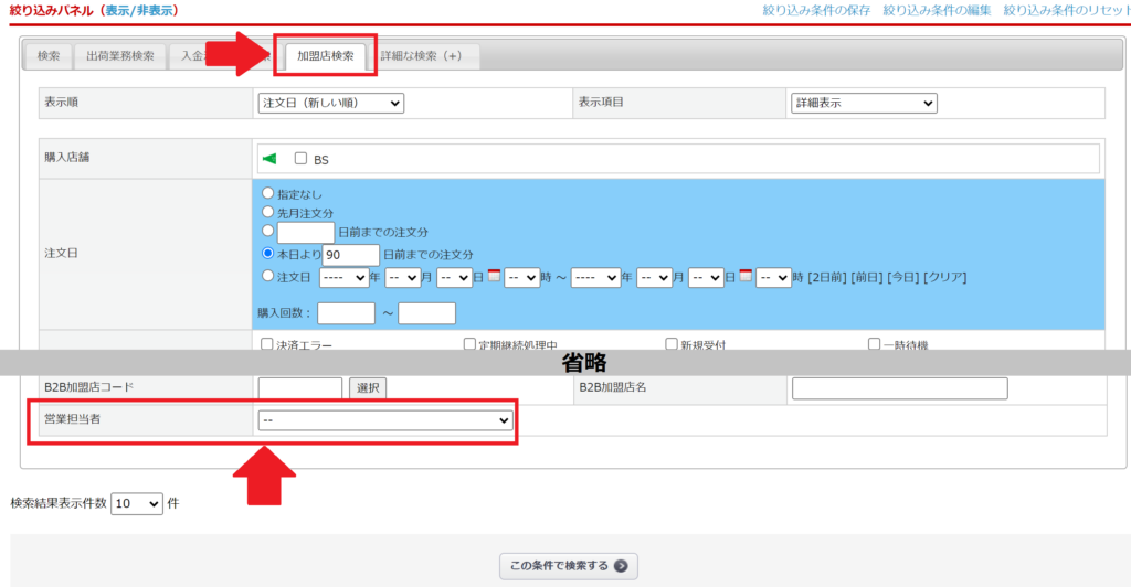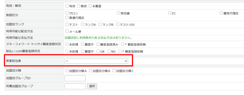 加盟店>加盟店一覧 の検索条件設定にて営業担当者を条件に加盟店を絞り込むことができます。