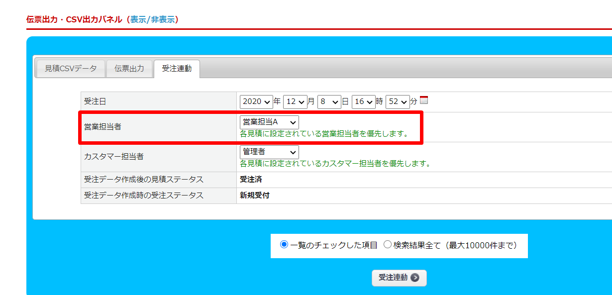 見積>見積一覧>伝票出力・CSV出力パネル>「受注連動」タブ