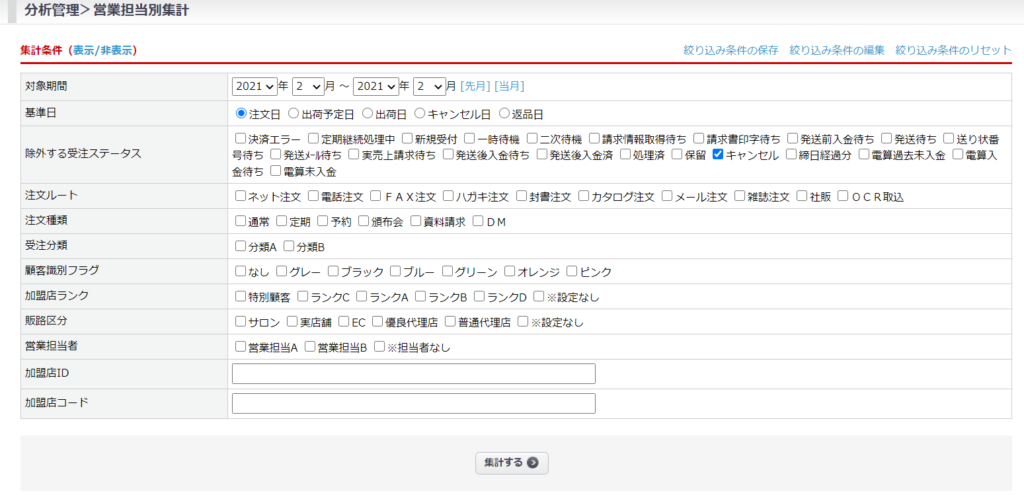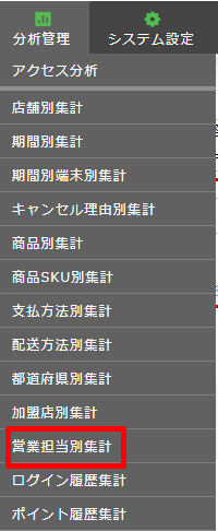 分析管理>営業担当別集計 にて営業担当者別の売上集計を確認することが可能となります。