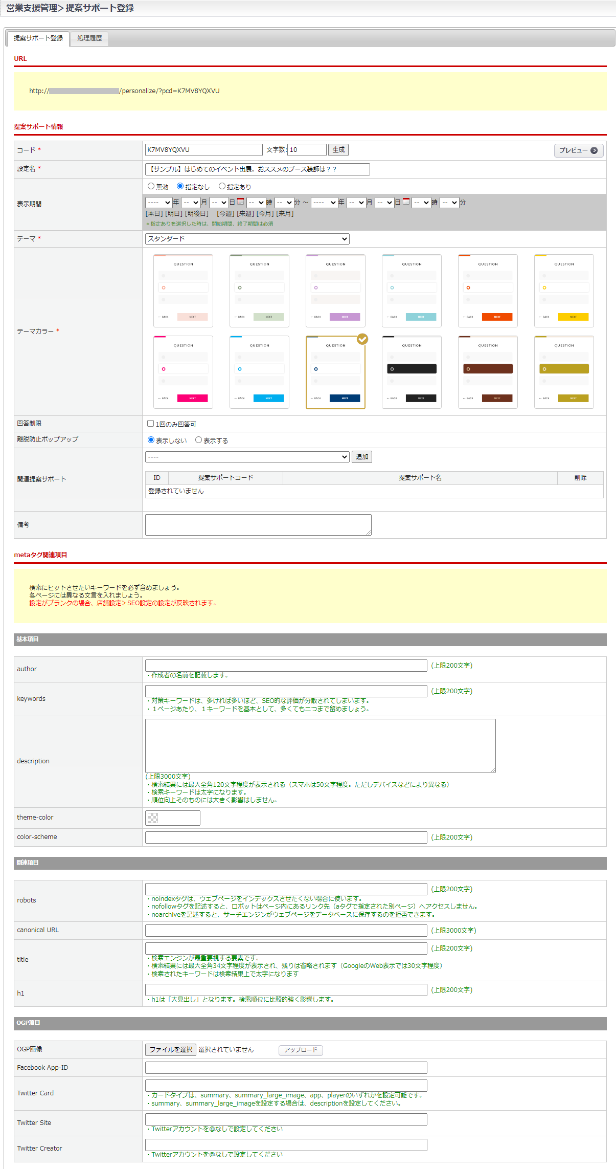 最初に提案サポートのコードや設定名、基本となるテーマカラーを登録します。