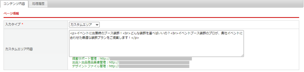 コンテンツ内容登録画面(画像の上部の文言を「入力タイプ」:[カスタムエリア]で設定)