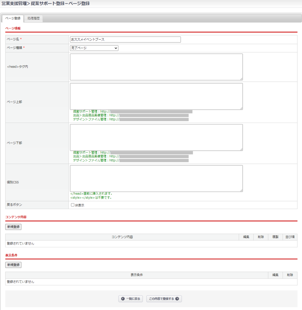 ページ登録 コンテンツ内容の【新規登録】ボタンをクリックし、