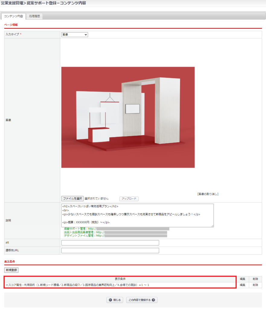 ・営業支援>提案サポート登録 ページ情報の【新規登録】ボタンをクリックし、
