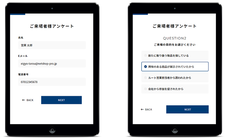 タブレットを用いて展示会や商談など幅広く、属性を含めた顧客情報の獲得に使用可能です。