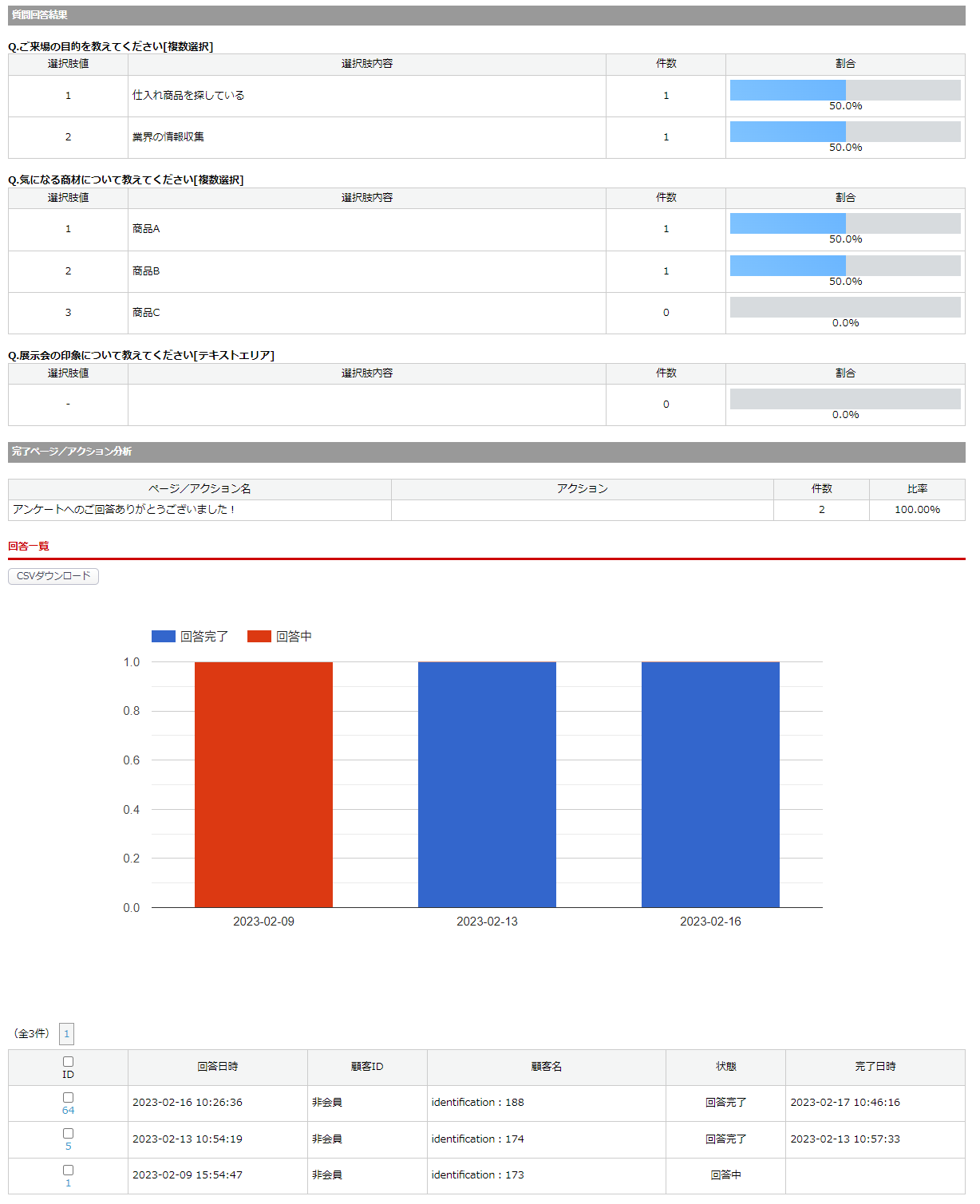 回答項目ごとの選択数や割合をレポート形式で確認できます。CSV形式でのダウンロードも可能です。