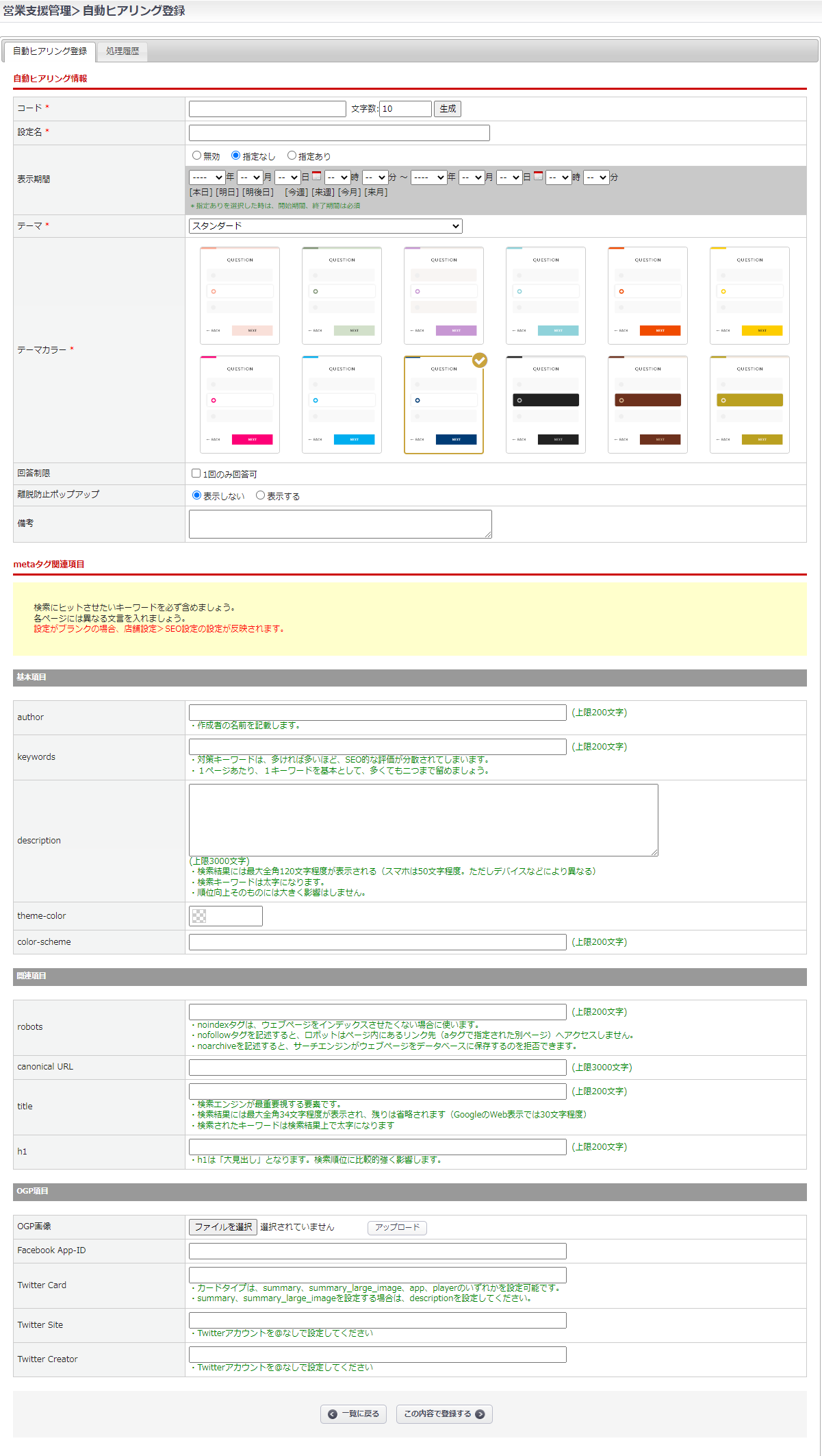 | 表示期間 | 自動ヒアリングを表示させる期間を設定します。 期間外の場合はアクセス時にエラーとなります。 |