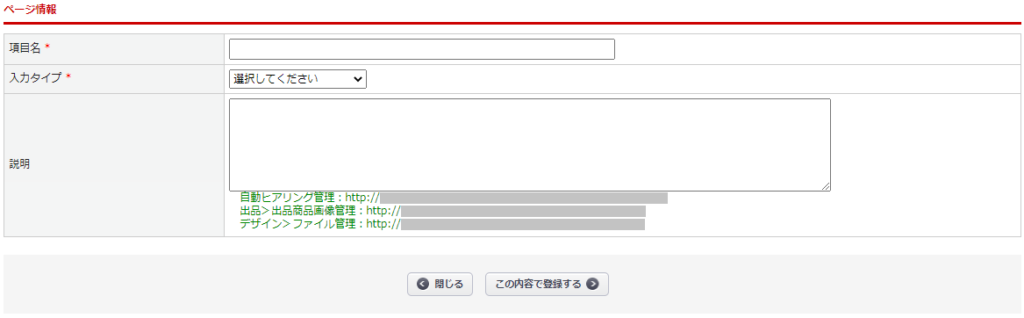 ページ情報のページ種類が[フォームページ]のとき、フォーム項目の【新規登録】ボタンより表示される画面です。セレクトボックスや日付項目の質問を設定することができます。