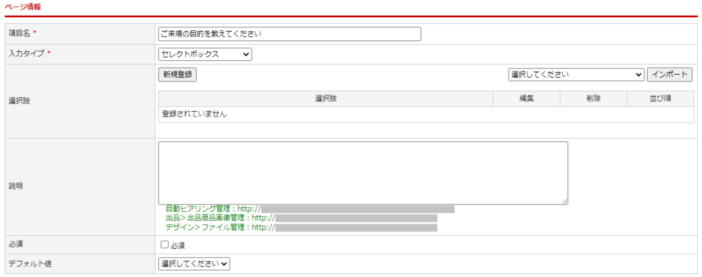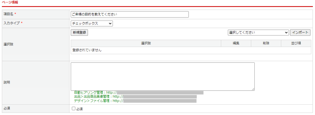 | 選択肢 | 選択肢を設定します。 <営業支援>自動ヒアリング登録>選択肢登録> ※ページ情報登録後に選択肢の登録が可能になります。 ※選択肢が1つも登録されていない場合、マスターからのインポートが可能です。 マスターを選択し、【インポート】ボタンをクリックすることで自動で選択肢がセットされます。選択肢マスターは、システム>マスター管理よりご登録可能です。 ![]() |