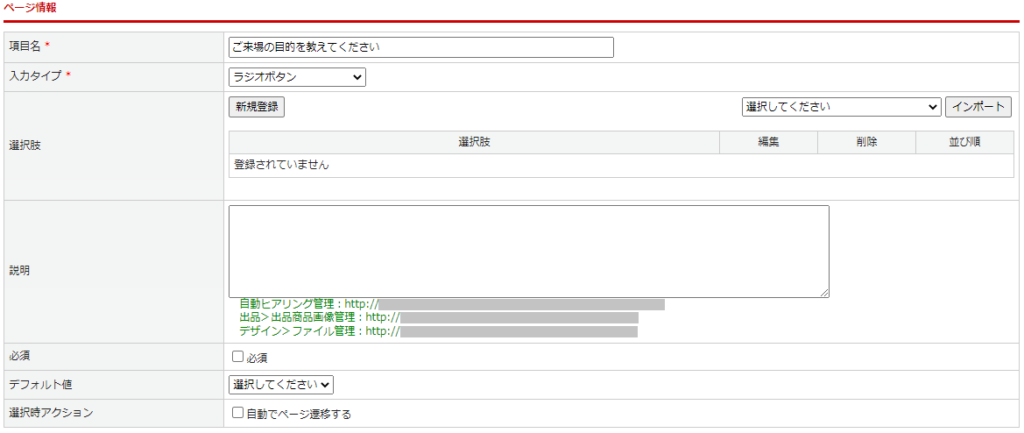 | 選択時アクション | 選択時のアクションを設定します。 「自動でページ遷移する」チェックありのとき、選択肢を選択後、ボタンをクリックせずに自動で次画面へ遷移します。 |