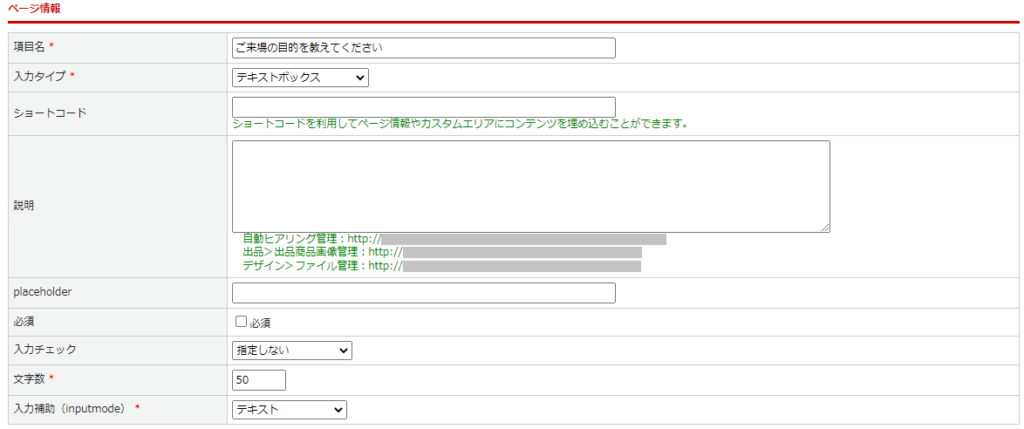 | 必須 | 必須チェックあり:必須入力となります。 必須チェックなし:任意入力となります。 |