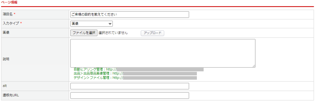 | 画像 | 【ファイルを選択】ボタンで表示させたい画像を選択し、【アップロード】ボタンで画像をアップロードします。 |