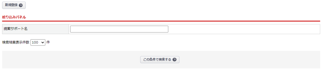 絞り込みパネルの「提案サポート名」に検索したい値を入力し、【この条件で検索する】ボタンをクリックすると条件に合う提案サポートが検索結果一覧に表示されます。