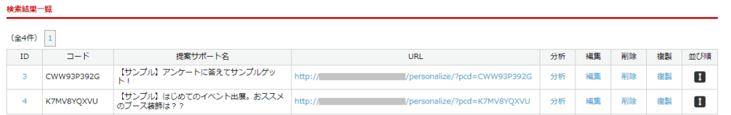 並び順検索結果一覧の並び順を移動し、移動後に表示される【表示順を更新する】ボタンをクリックすると提案サポートの並び順が変更されます。