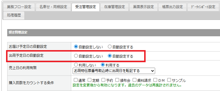 基本設定>管理システム設定>[受注管理設定]タブ 「出荷予定日の自動設定」より設定可能です。