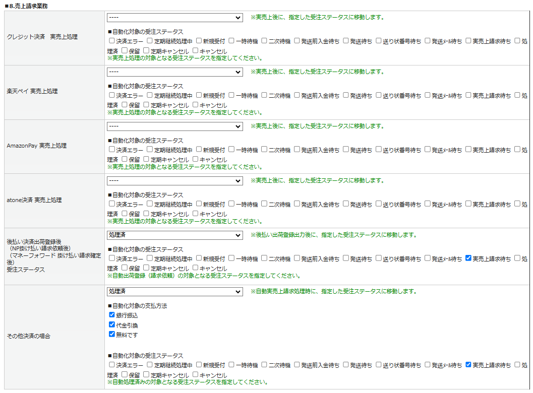 自動処理済み対象となる支払方法、受注ステータスを指定します。