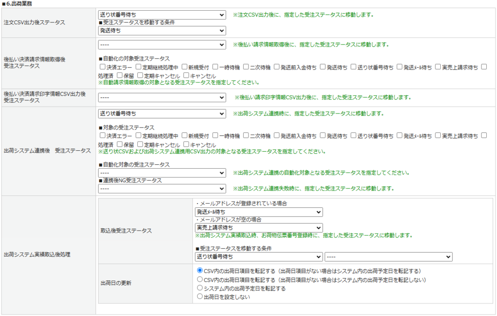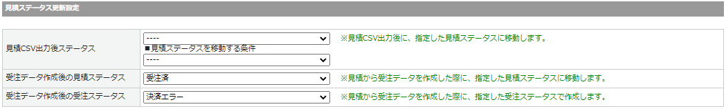 注文CSV出力後ステータス注文CSV出力後の移動先受注ステータス、および、