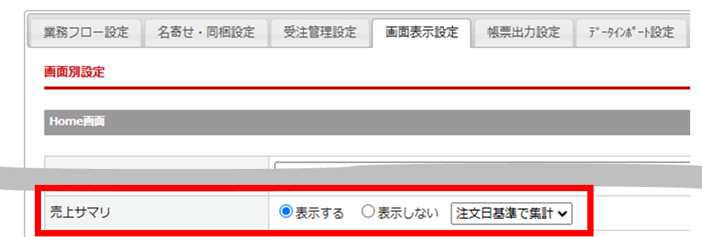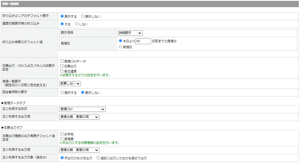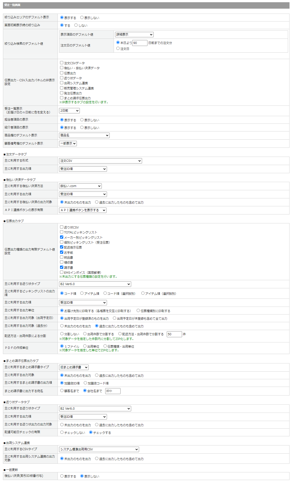 受注一覧、編集画面の各設定について、デフォルト表示などの設定を行います。