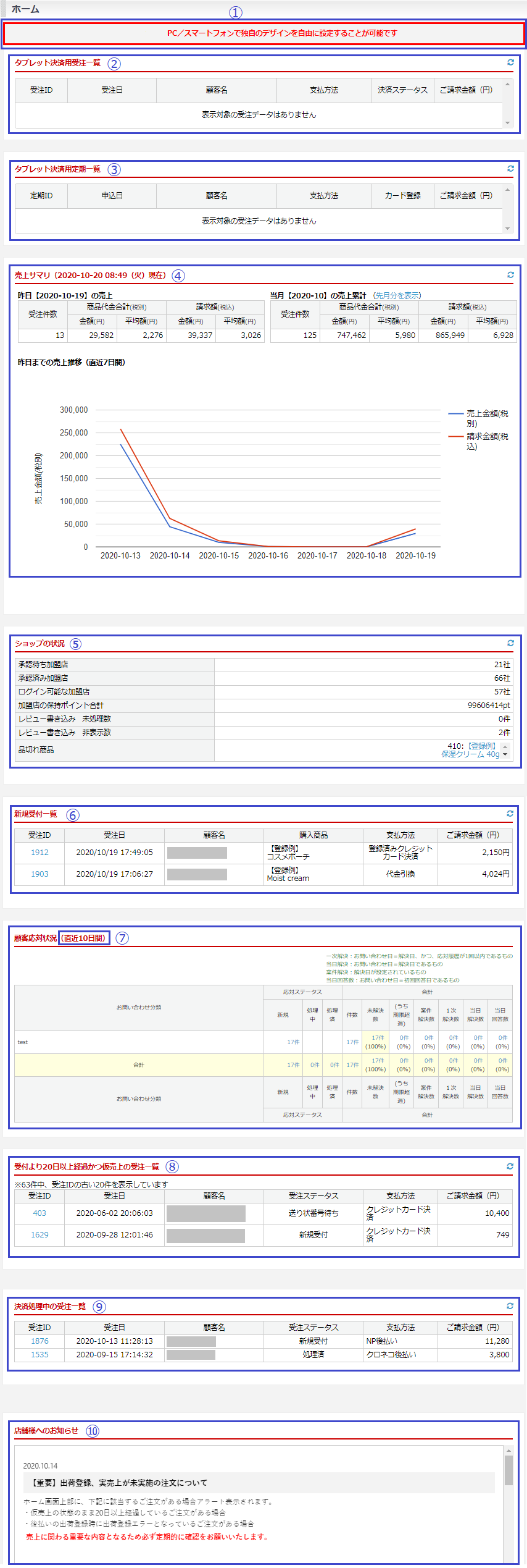 現在の会員数、レビュー書き込み未処理/非表示数、品切れ商品が表示されます。