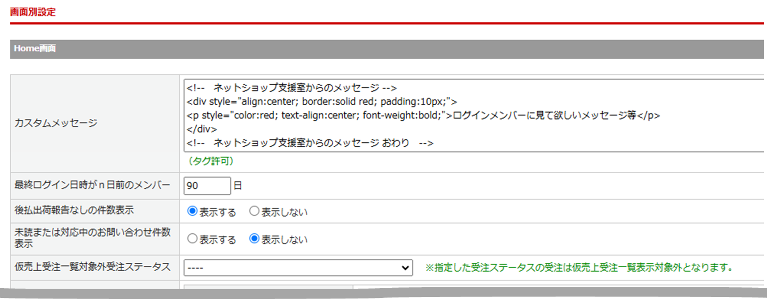 後払出荷報告なしの件数表示審査結果OKで出荷日登録済みの注文がある場合にホーム画面上部に表示するメッセージの設定です。