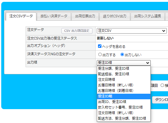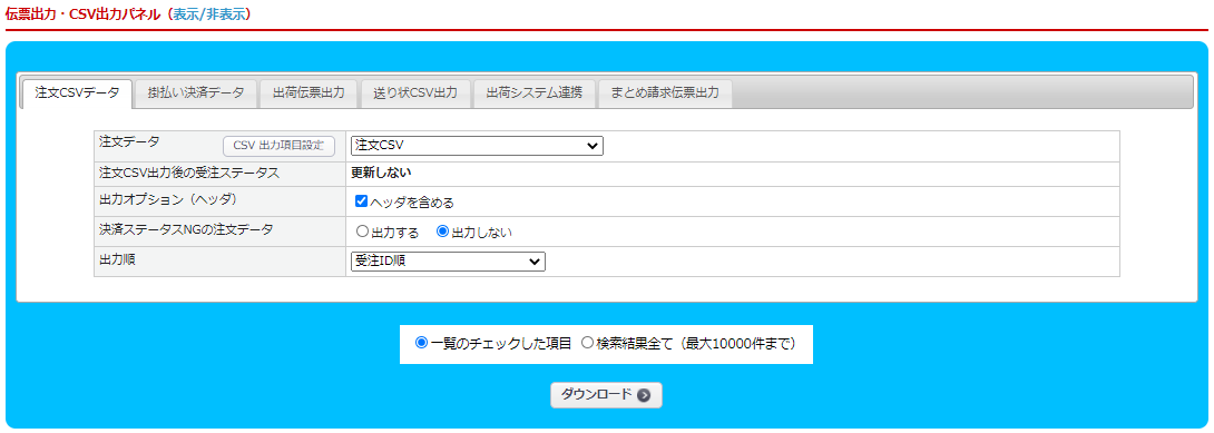 ダウンロードファイル形式 ダウンロードするファイルの形式をCSVまたはZIP形式から選択可能です。