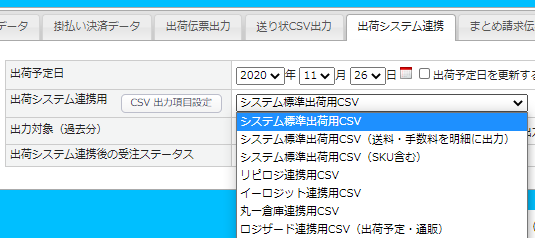 受注>お荷物伝票番号CSV取込でデフォルトにするCSVの設定が可能です。