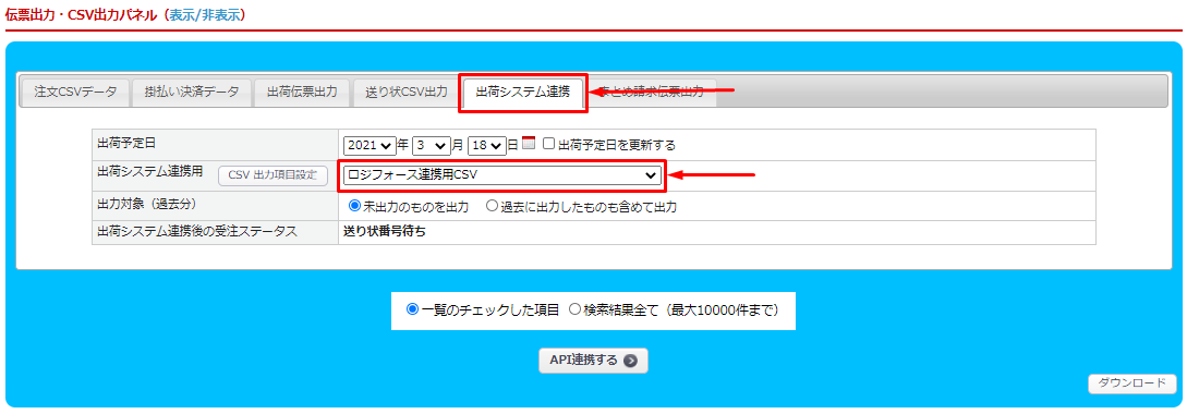 出荷システム連携用のプルダウンより「ロジフォース連携用CSV」を選択してAPI連携、CSVを出力します。