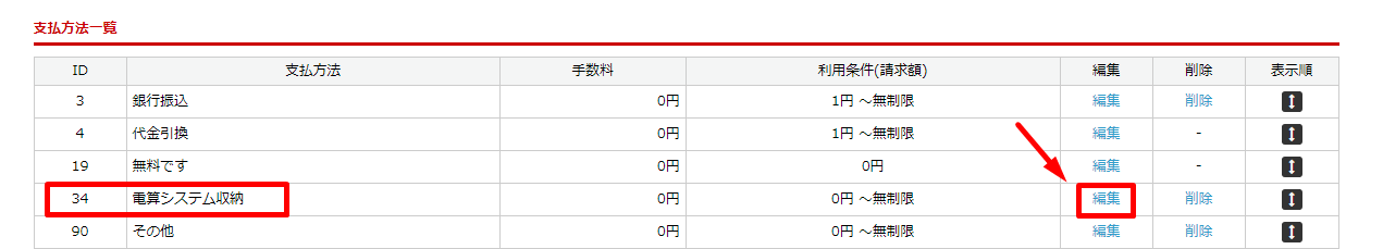 基本設定>支払方法設定>支払方法ID:34の「編集」