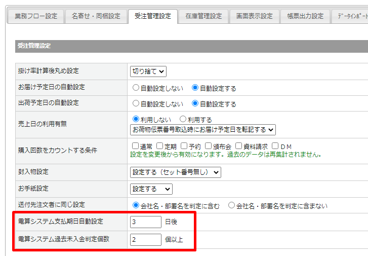 基本設定>管理システム設定>管理システム設定>受注管理設定